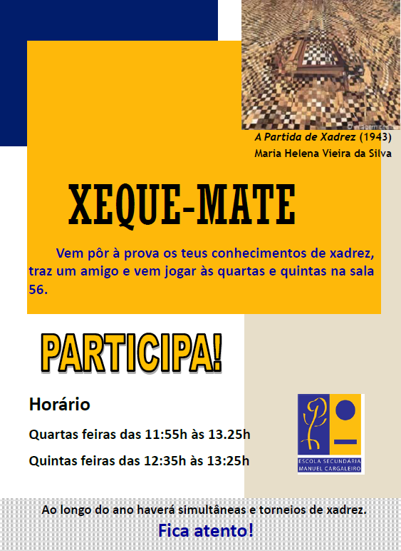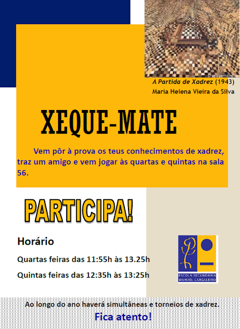 Vai realizar-se dia 4 de Abril das 10h ás 12.30h, mais um torneio individual de xadrez, na biblioteca da escola, com a colaboração da câmara municipal do seixal.